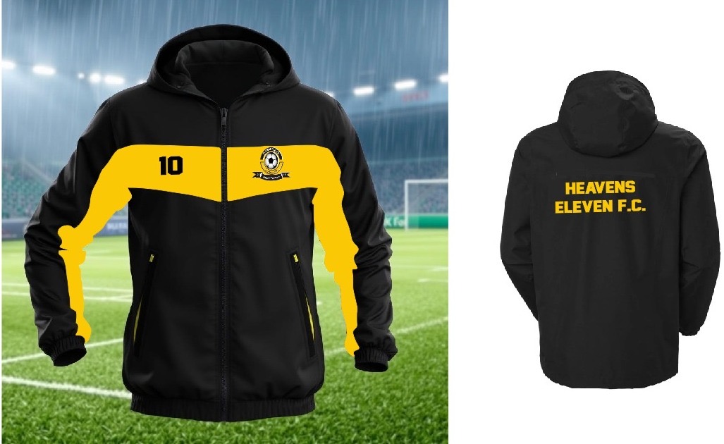 Elevate your game with the Heavens Eleven F.C. Jacket, a perfect blend of style and performance. Designed for athletes and fans alike, this jacket features a sleek black body accented with vibrant yellow details that add a striking contrast.